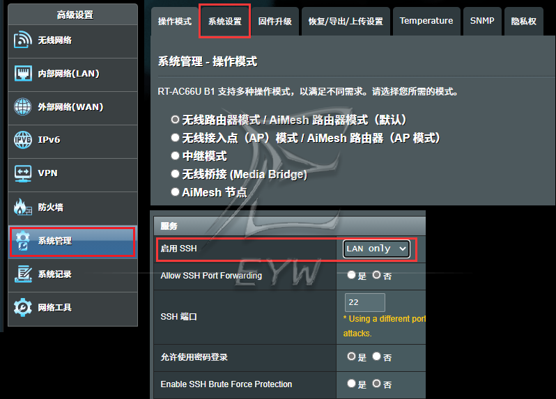找到启用 SSH选项,设置为LAN only,应用本页面设置