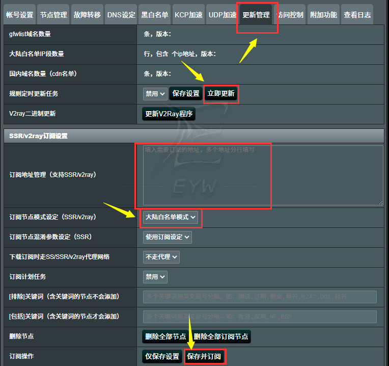 将订阅地址粘贴至订阅地址管理,订阅模式更改为大陆白名单 / 游戏模式,点击保存并订阅